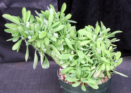 Widespread in India, where it is used to create hedges, Euphorbia nivulea is distinguished by its green stems and large, obovate leaves. We offer rooted cuttings of this species in its crest form in 8-inch pots.