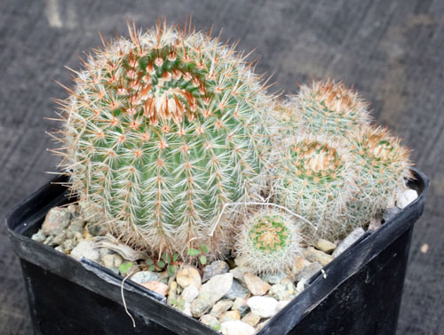 This species is from Argentina, Brazil, and Uruguay. It is a solitary to sparsely offsetting species with gray spines covering a squat, globose green body. The flowers are relatively large and yellow with pinkish tones. These plants are seedlings in 5-inch pots.