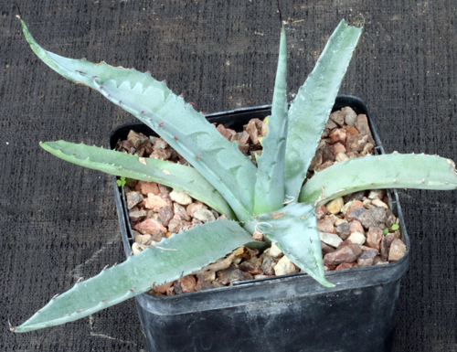 Occurring in the state of Durango, Mexico, near La Zarca, this plant of the Chihuahuan Desert prolifically offsets, forming clusters of plants. It is a relatively large species characterized by blue-green leaf surfaces with black, recurved spines along the margins. This species likely is hardy in Tucson. These plants are seedlings in 5-inch pots.