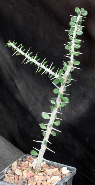 This rare Alluaudia, from Madagascar, is more of a shrub or a small tree than the other species. Similar to A. humbertii, this species has small green leaves on branches that cascade from a central trunk in a mature plant. The branches are spiny and relatively thin. We offer rooted cuttings of this species in 4-inch pots.