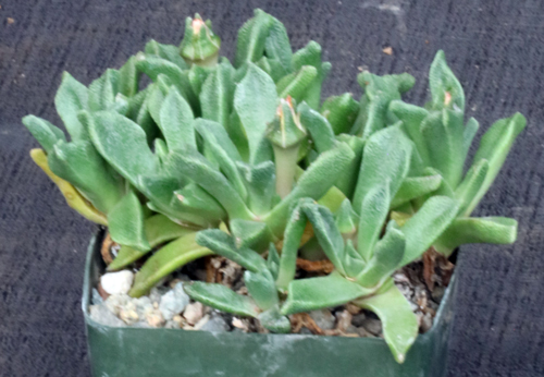 This wide-ranging species is from Botswana, Namibia, and South Africa, generally in the transition zone between summer and winter rainfall and generally growing in limestone crevices. In cultivation, the gray-green leaves with their furroughs lie flat in a rosette. The flowers are yellow. These plants are seedlings in 4-inch pots.