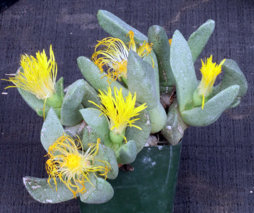 Pleiospilos compactus is distributed in South Africa over the area of the southern Northern Cape Province, northeastern Western Cape Province, and lapping into the Eastern Cape Province of South Africa. This species is highly variable, and the subspecies are generally distinguished by fruits and flowering stalks, in the case of P. compactus ssp. minor by its wider leaves and tumbling fruit. The flowers are yellow. These plants are seedlings in 4-inch pots.