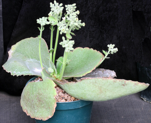 From Madagascar, this beautiful species has a woody, short stem. The leaves are large, succulent, ovate, and gray-green in color with a purple rim and scattered white teeth. The flowers are white with a purple blush. These plants are rooted cuttings in 8-inch pots.