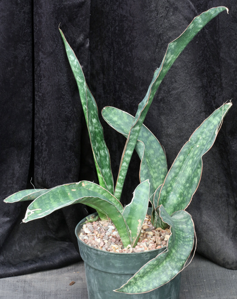 This is a newly described species from near Ngare Nanyuki, Tanzania (Bhitala 1008). This broad-leaf species has leaves that are rough on both sides, thickened in the center with a white-red margin, and stiff when long and mature. These plants are rooted offsets in 8-inch pots.