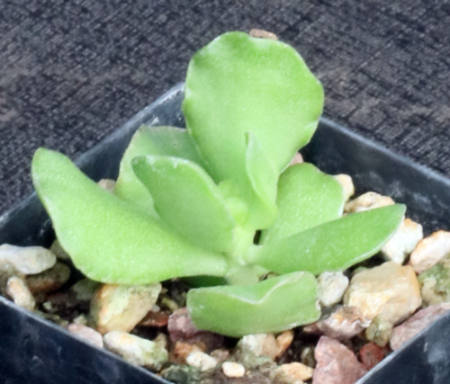 These plants, propagated from plants originally collected near the Oribi Gorge, Kwa-Zulu Natal Province of South Africa, which is far to the east from the type locality for this species. These plants, which some consider to be part of A. cristatus, have flattened leaves that are elongated, pale gray-green, and have subtle wavy and uneven margins. These plants are rooted leaves in 3-inch pots.