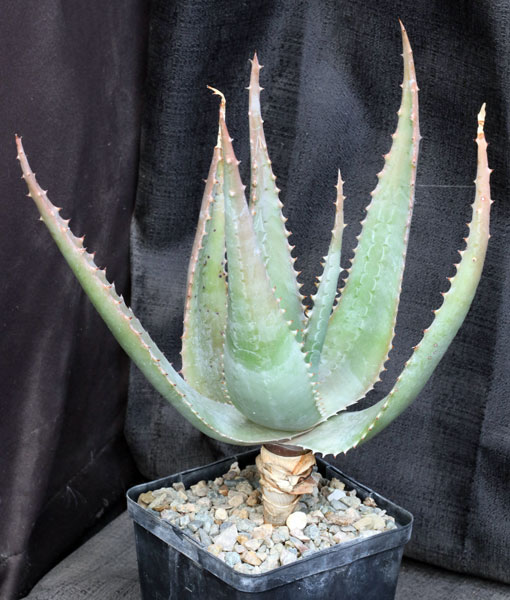 This is a natural hybrid between two widely distributed Aloes in eastern South Africa. The seeds were collected near Lebowakgomo, South Africa. We don’t yet know what these will look like when mature, but the guess is that, given the parents, they will have thick, gray-green leaves with lots of spines and possibly secund orange flowers. These plants are seedlings in 5-inch pots.