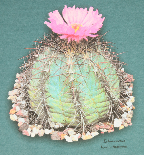 Our high-quality T-shirts (Comfort Colors) have an original image based on a photograph of Echinocactus horizonthalonius in flower. The color is Emerald.