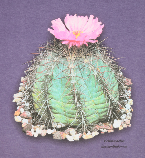 Our high-quality T-shirts (Comfort Colors) have an original image based on a photograph of Echinocactus horizonthalonius in flower. The color is Grape.