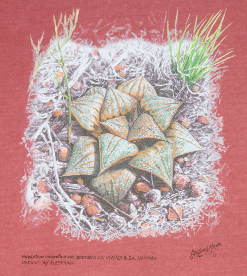 Our high-quality T-shirts (Comfort Colors) have original artwork of Haworthia magnifica var. splendens commissioned from Gerhard Marx, noted South African botanical artist, on the front. The color is brick, a reddish color.