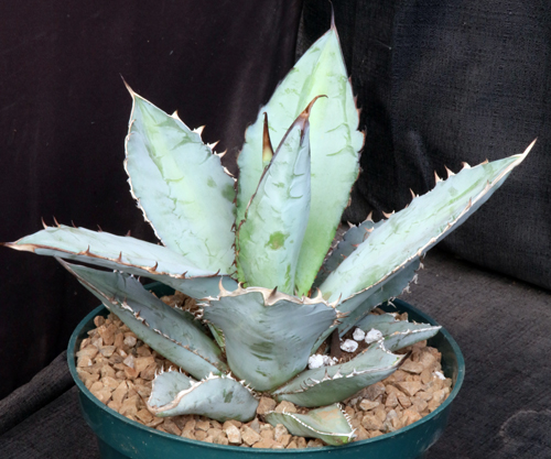 True Agave titanota is relatively rare in collections. Thanks to an influx of seed recently, a number of plants are now available. These plants have blue-green leaves with black marginal and terminal spines, reflecting the natural variability of this species in the wild. These rooted offsets are in 8-inch pots.