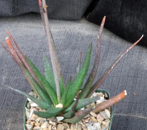 This extremely nice hybrid Aloe has lanceolate, sword-like leaves covered with black tubercles. This hybrid offsets slowly at our greenhouses. These plants are rooted offsets in 5-inch pots.
