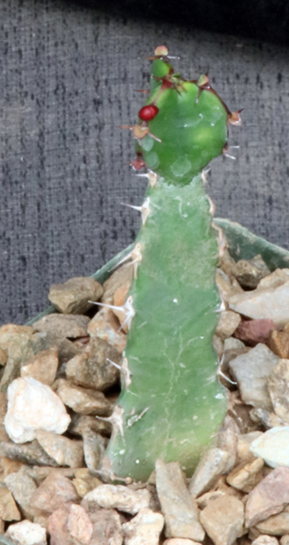 From the Malanje District of Angola, this species is a low mat-forming species in habitat. We suppose this looks like an Opuntia, if you say so. It actually looks like a tiny padded Euphorbia, with blue-gray stems with paired spines on the margins. What is really impressive about this species are the striking red cyathia produced along the stems. These plants are rooted cuttings in 4-inch pots.