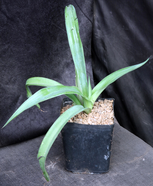 This is a hybrid is between Agave macracantha and Manfreda maculosa. This sparsely offsetting hybrid has thin, flexible blue-green leaves with purple speckles and rather stout terminal spines. These plants are rooted offsets in one-gallon pots.