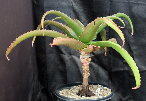 This beautiful tree Aloe is from Madagascar. The leaves are recurved downward and have a glossy green bronze color. The flowers are small, numerous, and red, and in our experience these plants flower at a height of about 3 feet. These plants take significant frost damage at 20F. These plants are seedlings in 5-gallon pots.