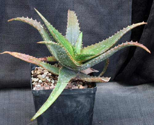 From Kenya and Uganda, this short tree, usually tipped over, sparsely offsets. The rosettes bear dark green leaves with yellow-white spots and an overall glossy appearance. The leaf margins bear reddish-brown spines on a brown-white margin. The flowers are a brick red color. These plants are rooted cuttings in one-gallon pots.