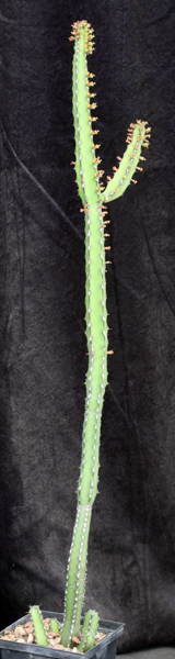 This species, from eastern Uganda and western Kenya, was propagated from material originally collected by the late Gilfrid Powys. This spiny shrub has four-angled stems with slight variegation and a nearly continuous spine shield that becomes continuous with age. The epithet comes from the fact that plants in the wild have a decreasing size of spines with height on the stems. The cyathia of subspecies baringoensis are crimson. These plants are rooted cuttings in 5-inch pots.