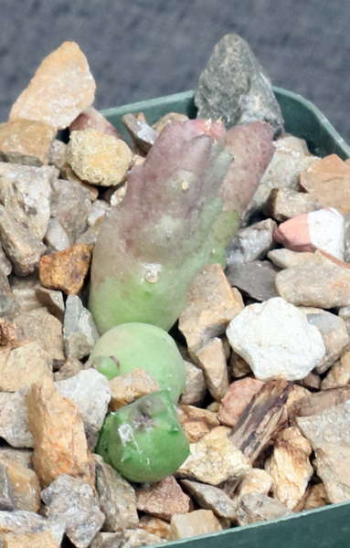Someone crossed Huernia thuretii var. primulina with Huernia zebrina ssp. magniflora to produce this cultivar. It has unremarkable green stems with short tubercles. The flower have yellow petals with a dark red annulus, which makes them kind of spectacular. These plants are seedlings in 4-inch pots.