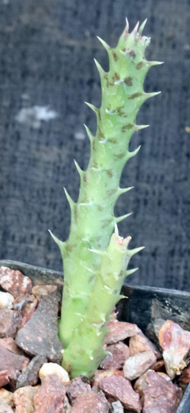 Taxonomically, this plant is difficult to place, because some think it a hybrid and others place it within Stapelia. Where it is placed is somewhat irrelevant, because this interesting succulent Asclepiad, from western South Africa, is one of the hardiest succulents we know about. Recently, in Tucson, our plants took 23F with full exposure and no damage. These plants are seedlings in 2-inch pots.