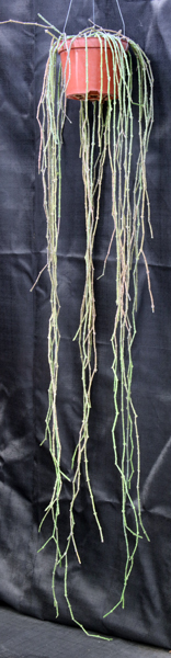 From southern Madagascar, this strange species has thing, string-like stems that are covered with irregular tubercles. In some ways, the stems have a surface that might have resulted from dripping a gray-green wax down a cylindrical stem. The flowers are equally odd but are an inconspicuous yellow-green. This species is easy to grow and forms a great hanging plant. These plants are rooted stems in 6-inch pots.