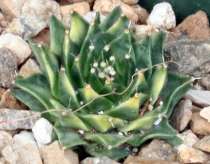 One of the most desirable (and unusual) of the cacti, Obregonia denegrii forms a flat rosette of smooth triangular tubercles with weak spines at the tip. This is another of the highly desirable living rock cactus, somewhat similar to Ariocarpus. The stems have yellow variegation. These plants are seedlings in 4-inch pots.