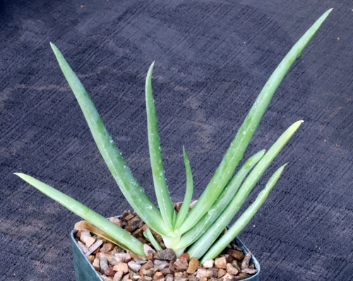 This tree Aloe is from the borderlands of Kenya and Tanzania. One of the few poisonous Aloes, it has unspotted yellow-green leaves and a smooth trunk with no leaf remnants. The flowers are red. These plants are seedlings in 5-inch pots.