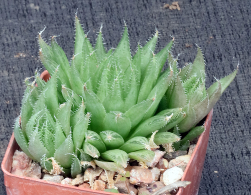Haworthia herbacea comes from the Western Cape Province of South Africa. Variety payneri is smaller than the typical plants and is scabrid with whitish marginal leaf spines. The upper flowers tend to be pinkish, unlike the typical species. These plants are seedlings in 3-inch pots.