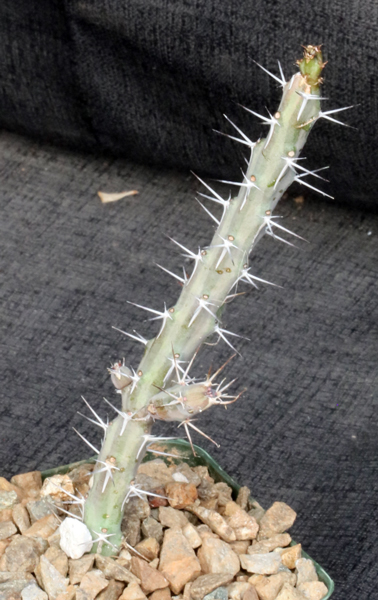 Euphorbia eyassiana is from the Mbulu District of northern Tanzania, and it grows in the Great Rift Valley near Lake Eyassa. This spiny shrub has rhizomatous stems that produce four-angled branches. This cyathia are yellow-brown. These plants are rooted cuttings in 4-inch pots.
