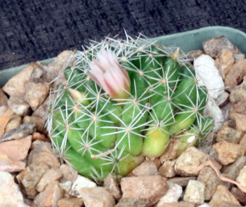 Formerly Mammillaria decipiens, this species is from Queretaro, Mexico. This species forms dense clusters. The stems are mostly obscured by wool, bristles, and spines. The flowers are small and white. These seedlings are available in 4-inch pots.