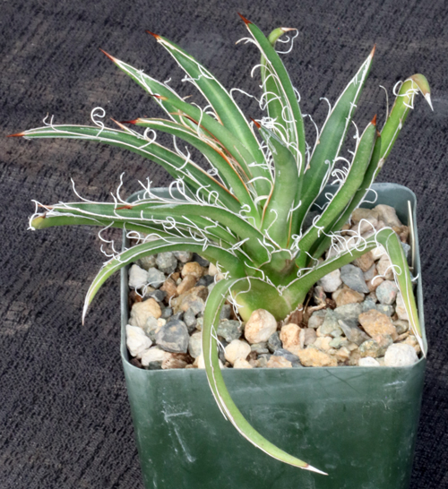 This species, widely distributed in Mexico generally east of the Sierra Madre, generally has a solitary rosette. The leaves are a beautiful dark green with a nice sheen and a shredding margin. These plants are seedlings in 4-inch pots.