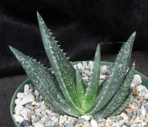 From the mountains of southern Saudi Arabia into northwestern Yemen, this acaulescent Aloe has affinities to several other species in the region, particularly Aloe tomentosa. The leaves are gray-green and spotted when young. The flowers are light yellow red and striped with green. These plants are seedlings cuttings in 6-inch pots.