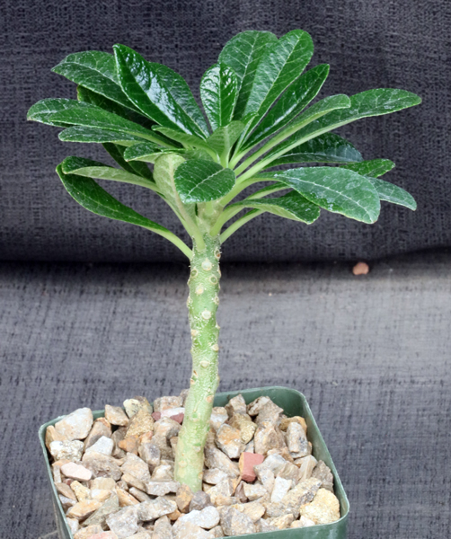The largest species in the genus and one of the most desirable is from the island of Socotra (Yemen), where it grows from vertical limestone cliffs. These plants have light green stems and distinctive dark-green lanceolate leaves. These plants are rooted cuttings in 4-inch pots.