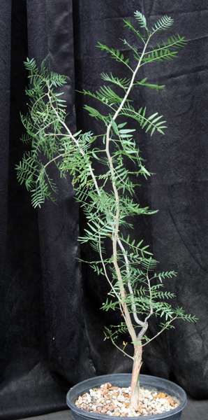 A native of Arizona and California, and extending southwards into Sonora and Baja California, this species of the genus Bursera develops a thick trunk with light gray-brown bark and finely pinnate leaves. This form has longer leaflets and comes from the Waterman Mountains of Arizona. We grow this species outside in Tucson, where it withstands 25F; heavier frost actually sculpts the plants into a nicer, more compact form. Our plants are rooted cuttings in 2-gallon pots.