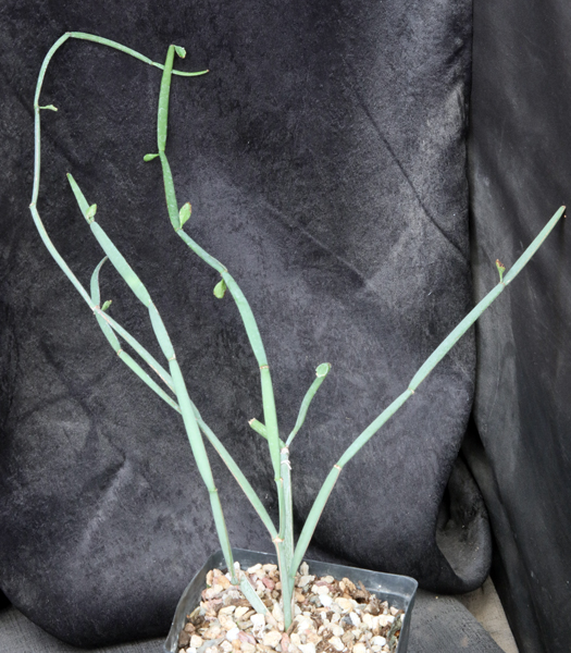 Widespread in the uplands on the island of Socotra (Yemen), this species is a low shrub that produces climbing stems. When mature, the stems are H-shaped in cross section and gray-green in color. The leaves are small and inconspicuous, and the flowers are inconsequential. These plants are rooted cuttings in one-gallon pots.