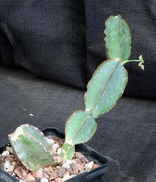 This species, which ranges widely on the eastern side of Africa, is a climbing succulent vine. These plants are propagated from material originally collected from eastern Kenya (WY 1203). Once you see those leaves, you readily put it in the Vitaceae (grape) family. The stems are quadrangular with wavy margins between the nodes. This clone has a blue-green body with pinkish-red wavy margins and the stem is a little more robust than the typical form. We offer rooted cuttings of this species in 5-inch pots.