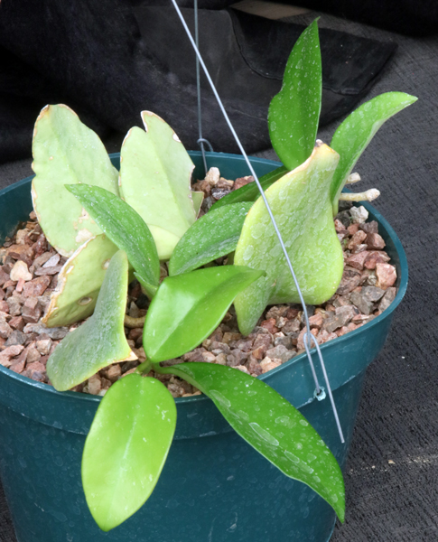 This species, widely distributed in southeastern Asia and the Pacific Islands (including Australia), is one of the most common Hoyas in cultivation. The lancheolate leaves are green and unremarkable, albeit unmistakably belonging to the Hoya group because of their leathery feel. Dee’s Big One probably refers to the larger than typical leaves. The inflorescence has as many as 30 flowers, which are light purple to reddish in appearance. These plants are rooted cuttings in 6-inch pots.