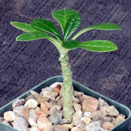 The largest species in the genus and one of the most desirable is from the island of Socotra (Yemen), where it grows from vertical limestone cliffs. These plants have light green stems and distinctive dark-green lanceolate leaves. These plants are rooted cuttings in 3-inch pots.