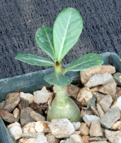 This species, from the southern Arabian Peninsula, has numerous branches arising from a low, wide caudex. The smallish flowers are pale pink, and the leaves are softly pubescent. This cultivar was selected because, as the name indicates, the caudex tends to be fatter than the typical species. These seedlings are in 3-inch pots.