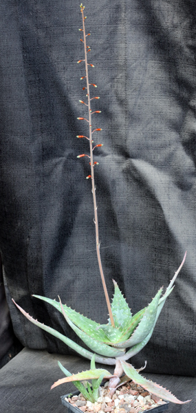 This species, collected by Dee Roberts (Roberts 55) near Niensi, Tanzania, is a small offsetting maculate Aloe. The flowers are red and secund, and this character is what distinguishes it from other similar species, such as Aloe bukobana. These plants are rooted cuttings in 5-inch pots.
