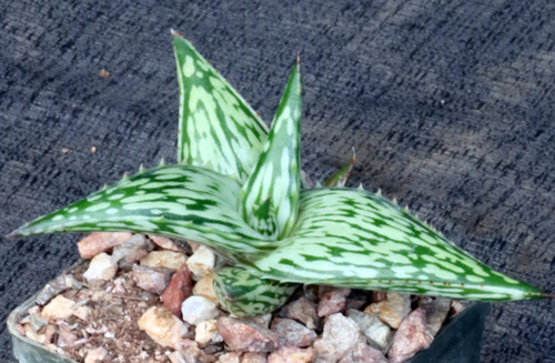 From Somalia, this species is part of a complex that includes A. somalensis, A. harlana, and A. peckii. A. hemmingii sparsely offsets from its small rosettes that bear lancheolate brown-green leaves with near-linear white spots. The inflorescence is relatively short with small pink-red flowers. These plants are seedlings in 3-inch pots.