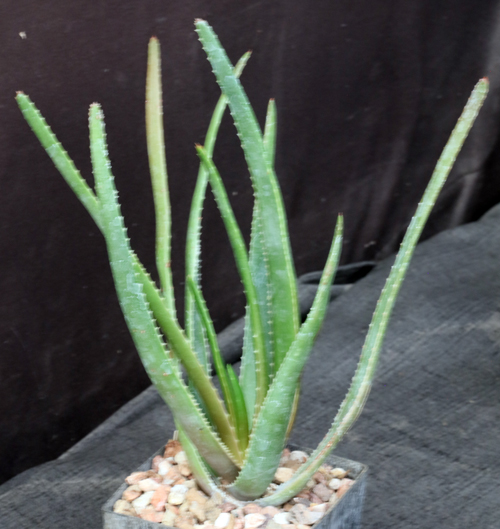 Aloe werneri is from southeastern Madagascar. It is a small to medium sized species with green, linear leaves. The flowers are green with white stripes. These plants are rooted offsets in 5-inch pots.