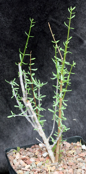 This succulent shrub from South Africa and Namibia has miniature pink flowers. It is common in the Richtersveld in the hyperarid area of the Northern Cape, and it forms a caudex when buried by sand. The leaves are pale green and fleshy, and the branches taper to a fine diameter at their ends. This unusual form has greatly reduced leaves. These plants are rooted cuttings in one-gallon pots.