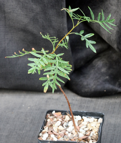 This pachycaul tree is from northern South Africa with a distribution into Zimbabwe. The plants have a knobby stem with pinnate leaves with long, lance-like pinnae. The seed pots are large and inflated. These plants are seedlings in 5-inch pots.