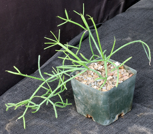 This species of epiphytic cactus is widespread in southern and southeastern Brazil. Usually cylindrical but also 3 angled, the green stems are typically unarmed and smooth. The flowers are small, yellow-white, and borne along young stems. These plants are rooted cuttings in 5-inch pots.