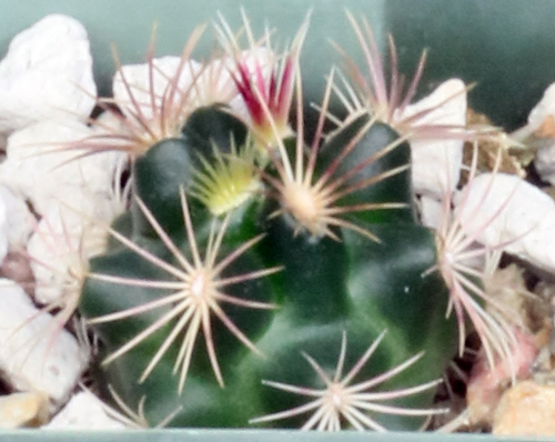 This subspecies is from Texas and Chihuahua, Mexico. It is part of the larger T. bicolor complex, which features relatively small-bodied plants with large flowers, typically purple petals with yellow centers. Subspecies schottii differs with a papery central spine. These plants can withstand significant frost and can be grown in the ground in Tucson. We offer seedlings in 2-inch pots.