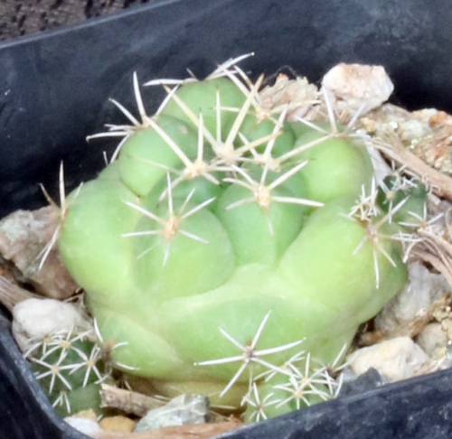 This species is from Oaxaca and Veracruz, Mexico. Its light-green body is covered with tubercles bearing whitish spines, and it slowly offsets. The flowers are relatively large and yellow. These plants are seedlings in 2-inch pots.