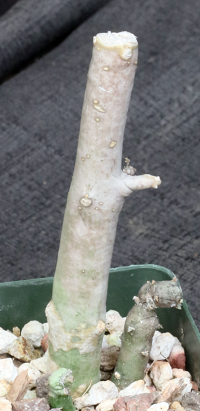 From the Arabian peninsula and East Africa, this species represents a highly complex and variable group of plants. The stems are relatively small in diameter, dark olive green, and striped with brown. The flowers are complex, as usual, but dominantly white with green and violet highlights. These plants are rooted cuttings in 4-inch pots.