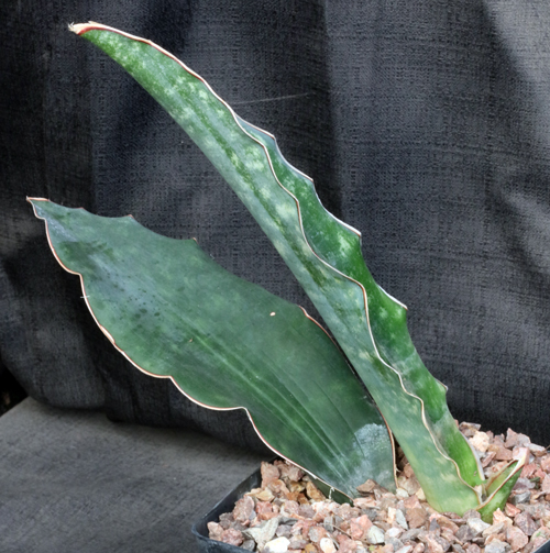 From Tanzania, Malawi, and Zanzibar, this broad-leaf species has long, down curving leaves mottled with green and white and bearing limited pink-red tones. The leaves have a wavy margin, a rough feel on the backside, and a flexible apical tip and are smooth to the touch. These plants are rooted offsets in one-gallon pots.