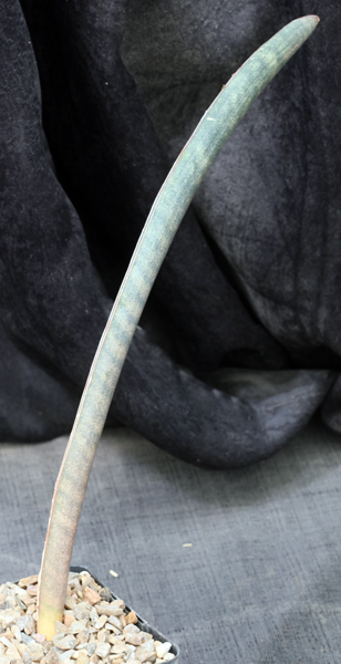 This species is from Zimbabwe. These plants have blue-green leaves with a pinkish cast that appear like short folded straps. The mature leaves are the familiar javelin spikes variously called “bats.” These plants are rooted offsets in 5-inch pots.