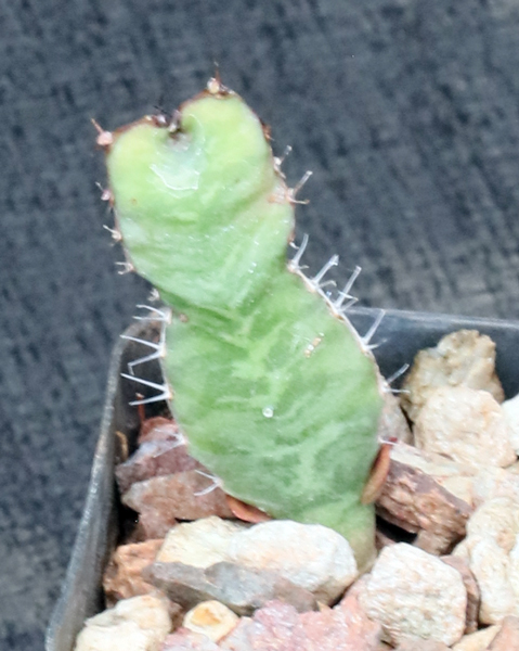 From the Malanje District of Angola, this species is a low mat-forming species in habitat. We suppose this looks like an Opuntia, if you say so. It actually looks like a tiny padded Euphorbia, with blue-gray stems with paired spines on the margins. What is really impressive about this species are the striking red cyathia produced along the stems. These plants are seedlings in 2-inch pots.