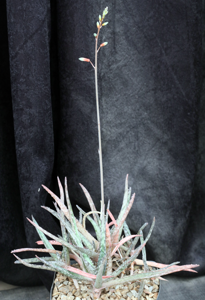 This hybrid, developed by the late the late Nathan Wong, is based on A. rauhii. As the name suggests, the leaves have a strong blue cast with some streaks of pink-red coloration. The flowers are small and light red in color. These plants are rooted cuttings in one-gallon pots.